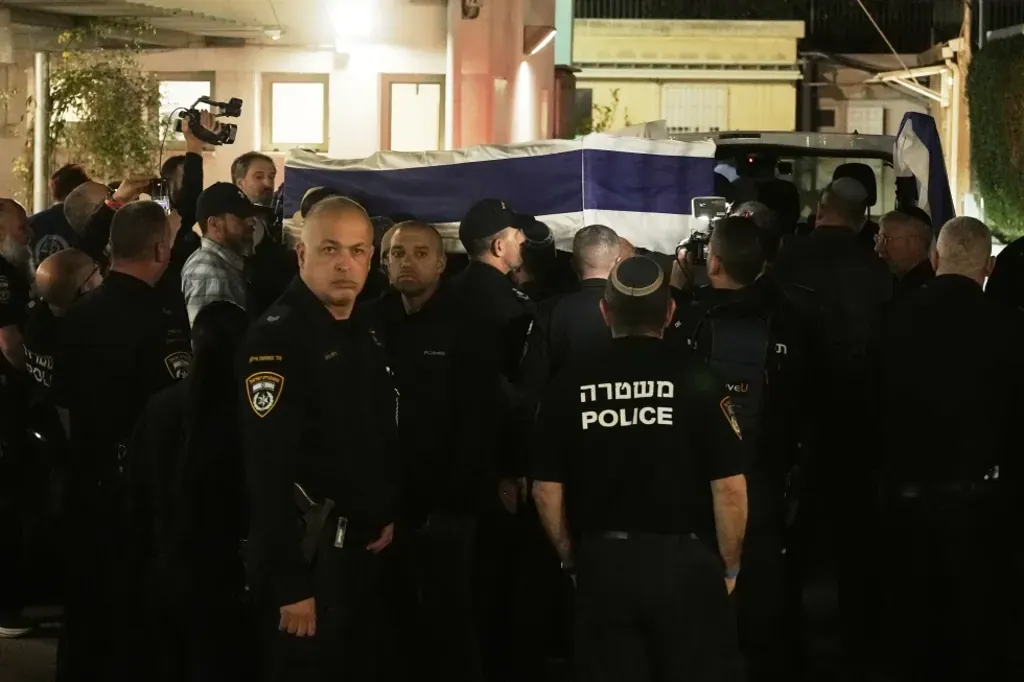 Gvili’s coffin, draped in an Israeli flag, was received at an army post near the Gaza border by relatives, police officers from his unit, and senior military officials. Crowds gathered along nearby roads as the convoy traveled toward Tel Aviv, where it arrived Monday night.